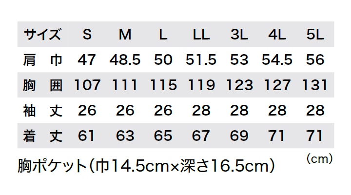 ●胸ポケット:巾14.5cm×深さ16.5cm